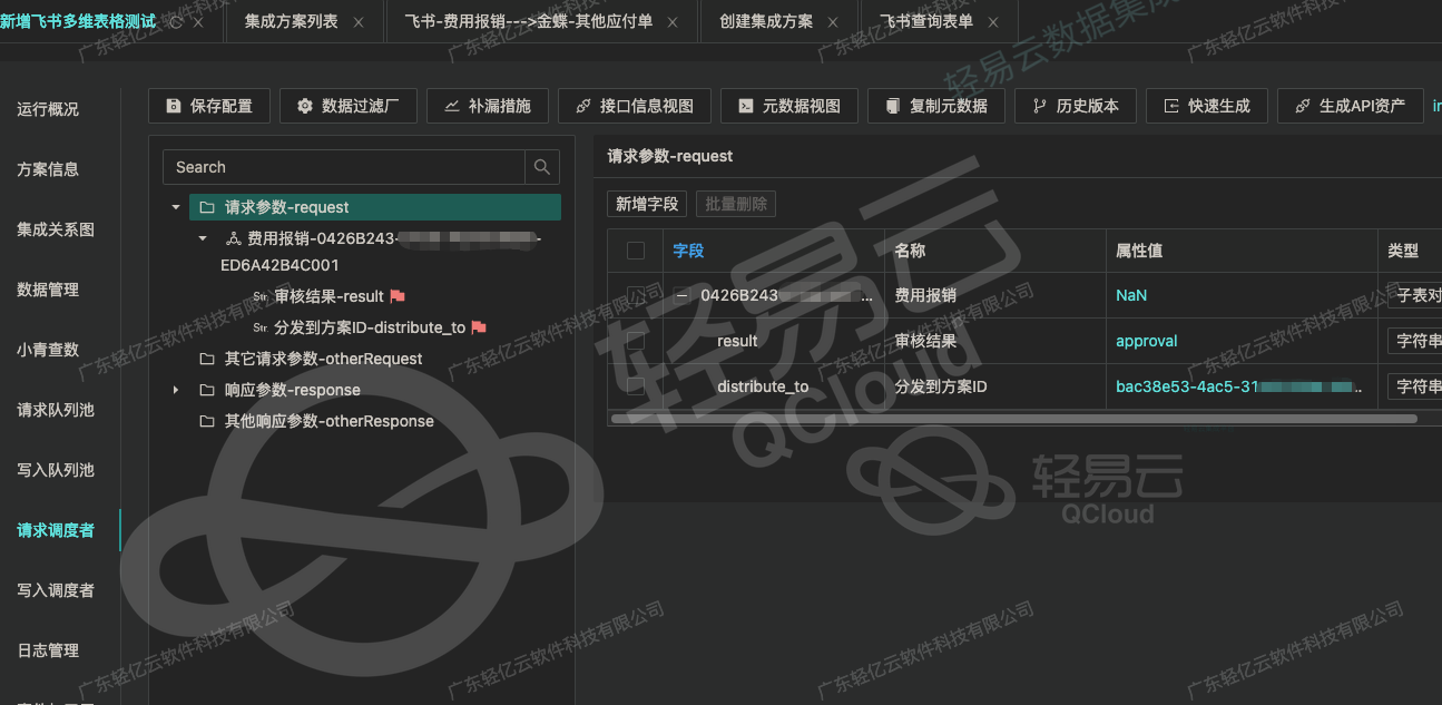 配置完回调地址, 通过 订阅审批事件 接口把要开启事件订阅的审批开启, 飞书审批中有很多审批表单,包括自定义的表单。这些表单默认都是不会触发审批的,需要通过下面这个接口开启订阅。具体描述见下图 https://open.feishu.cn/document/server-docs/approval-v4/event/event-interface/subscribe?appId=cli_a77993bfb2f6100d 通过方案请求 订阅审批事件 接口时使用,FSSubscribeQueryAdapter这个适配器 这个适配器只是用于处理“ 订阅审批事件 ”这个接口!! 通过oa后台编辑审批表单可以在url中获取表单的id,用这个表单id作为参数调用 订阅审批事件 接口即可开启该审批的事件订阅 添加要触发回调的事件 方案配置-请求参数: 子表对象的字段名是审批表单的id 子项: result固定approval distribute_to填要分发的方案id