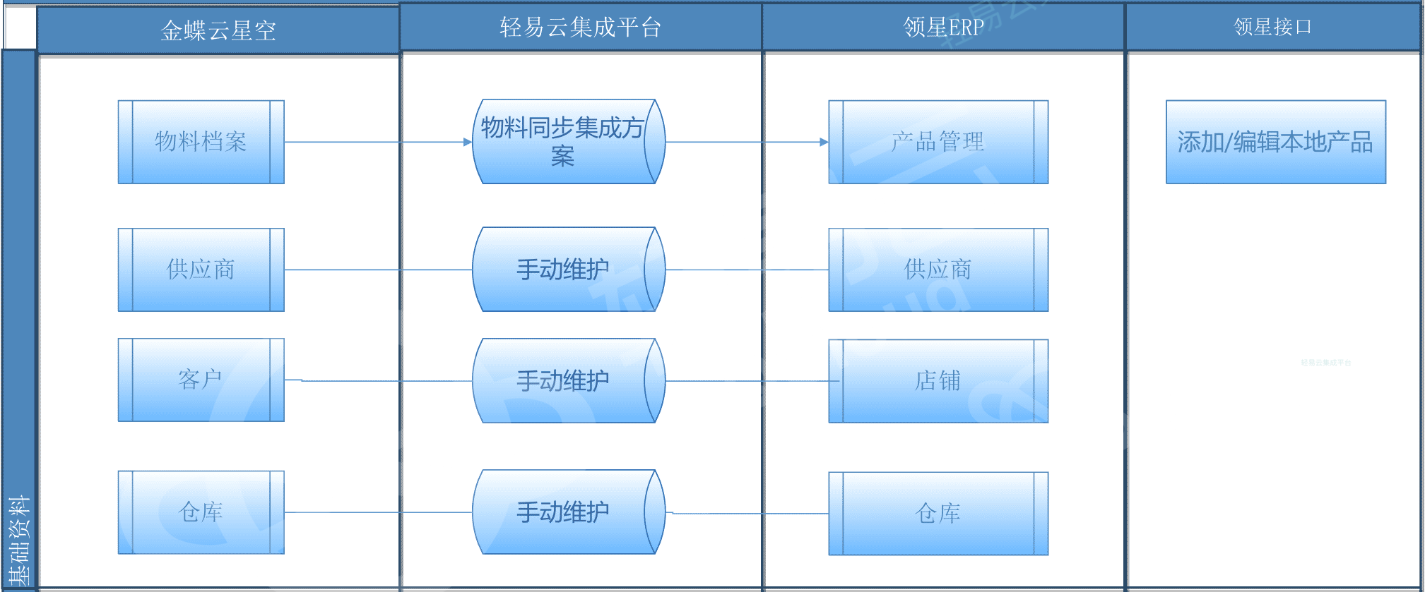 | 领星系统 | <-----> | 轻易云数据集成平台 | <-----> | 金蝶云星空旗舰版 |