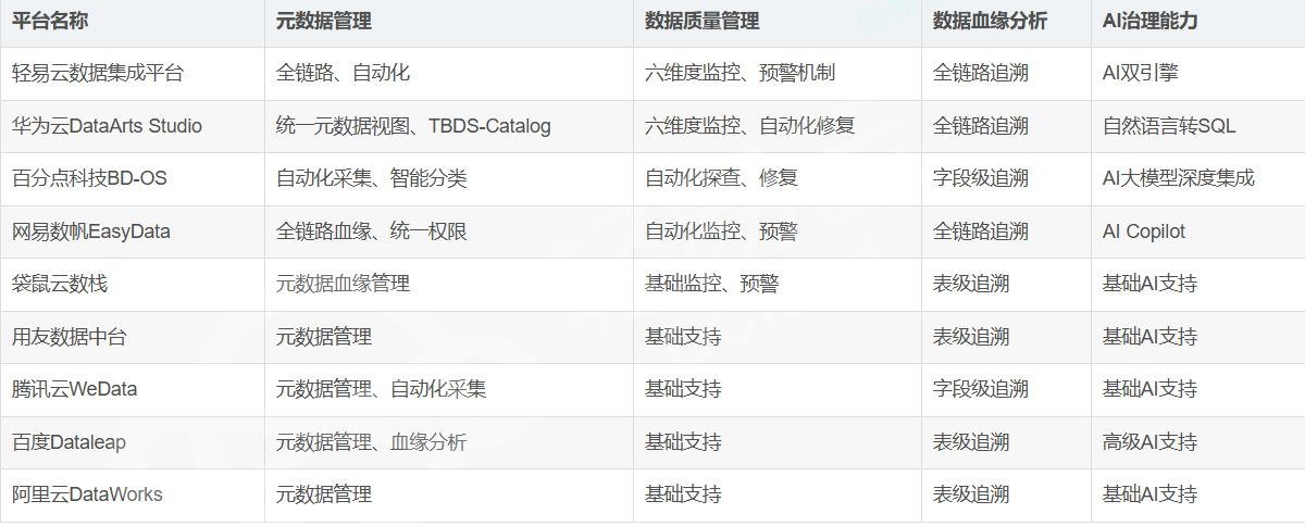 阿里云DataWorks:元数据管理基础支持,数据质量管理基础支持,数据血缘分析支持表级追溯。