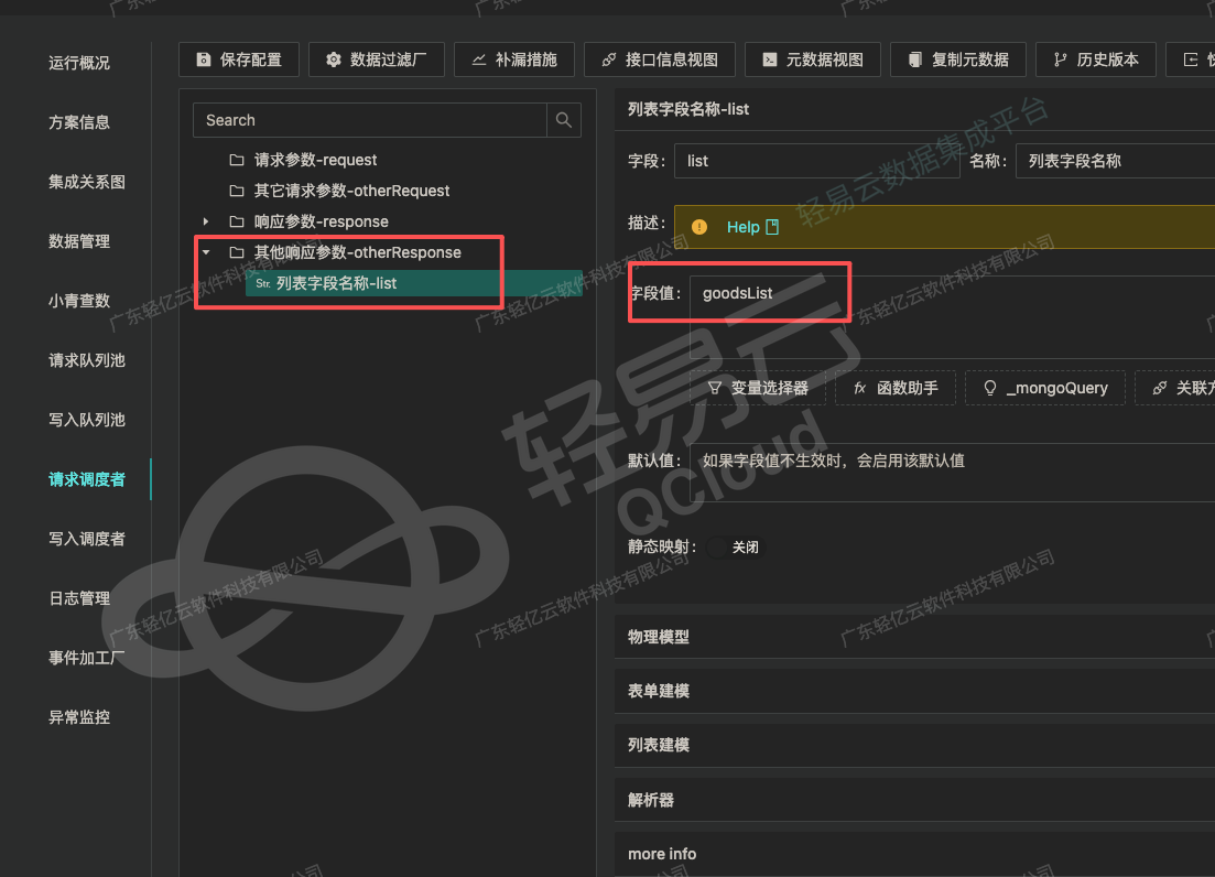 需要请求调度者中的其他响应参数,字段使用list,值根据接口对应字段来填写。 没加适配器默认取stockList当list,没有stockList这个字段就会报错