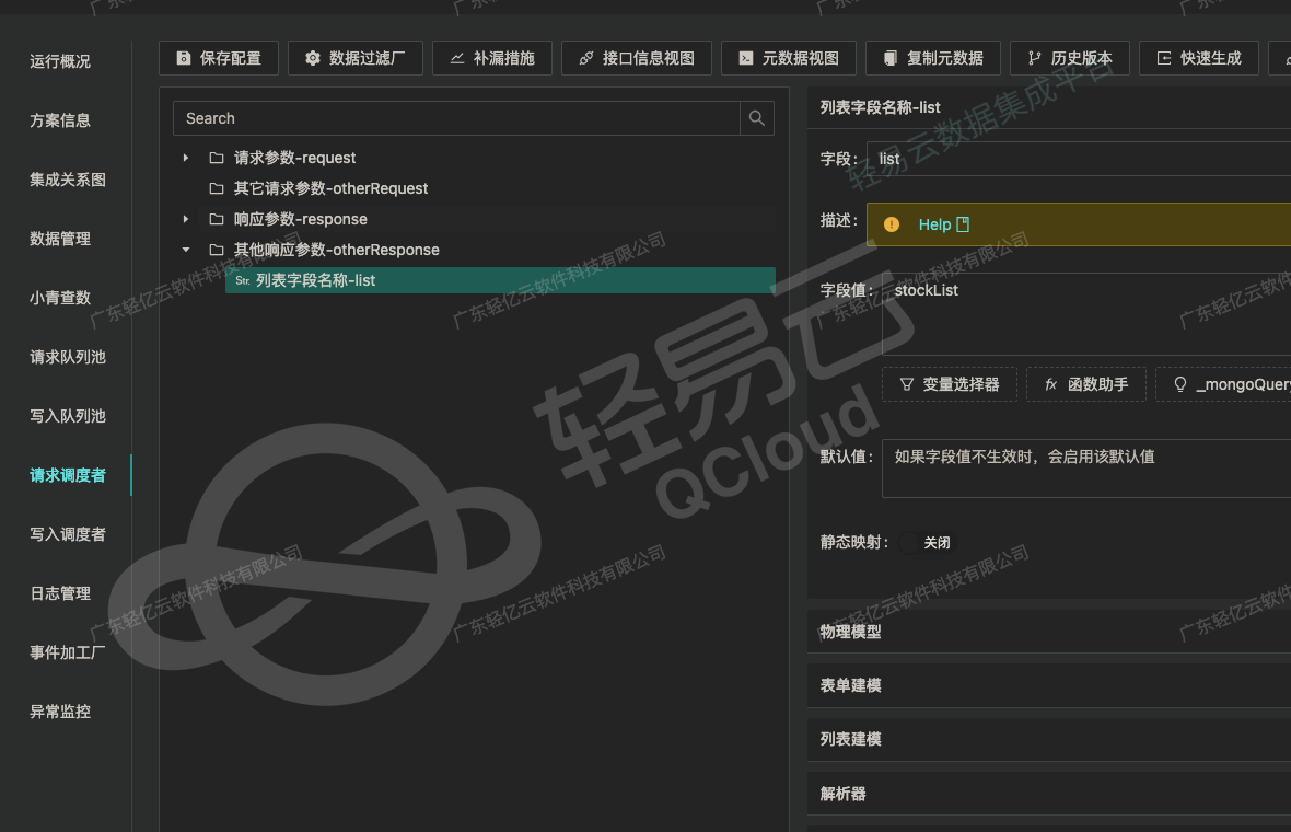 需要请求调度者中的其他响应参数,字段使用list,值根据接口对应字段来填写。 没加适配器默认取stockList当list,没有stockList这个字段就会报错