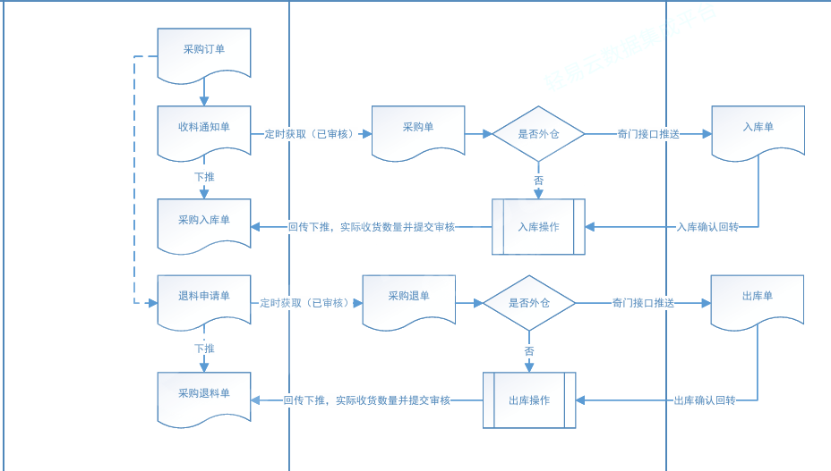 ERP 下《采购订单》→OMS《收料通知单》→WMS 质检入库→《采购入库单》→ERP 生成采购结算单→财务审核记账(借 库存商品/进项税 贷 应付账款)