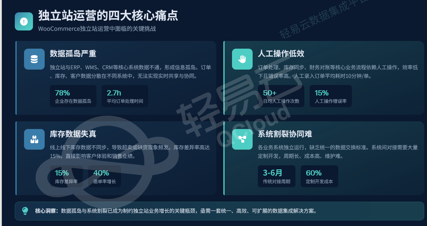| 系统割裂 | 独立站与 ERP/WMS 缺乏标准接口 | 需大量点对点集成开发 |