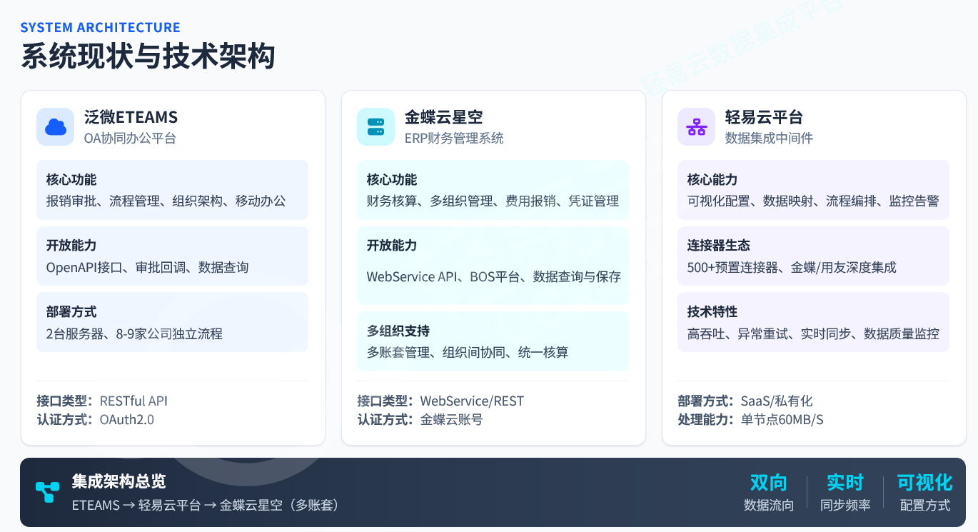 | 八九家公司ETEAMS报销进不同账套 | 部门即组织,自动路由 | 1. 梳理部门-账套映射表<br>2. 配置智能路由规则<br>3. 审批完成自动分拣写入 |