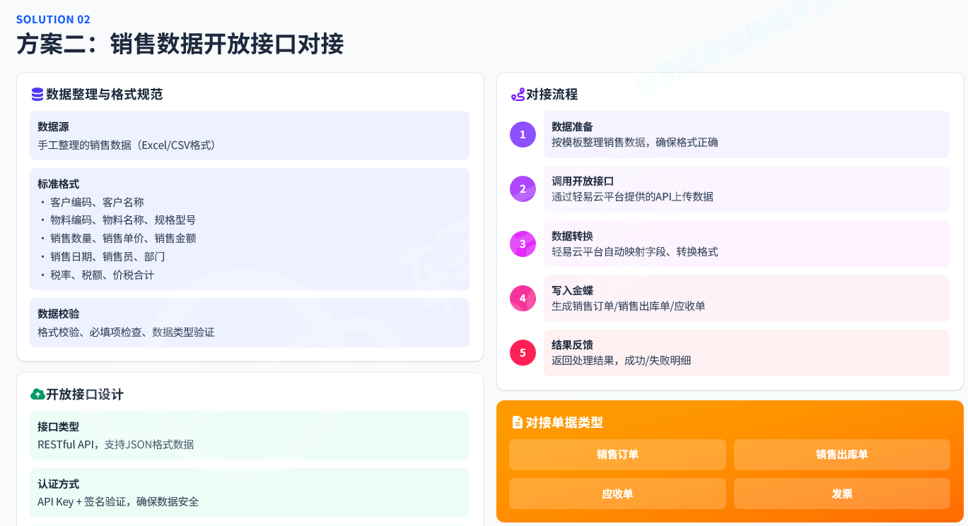 | 销售数据Excel导入金蝶 | 模板+接口,批量导入 | 1. 定义标准Excel模板<br>2. 配置开放接口或文件触发<br>3. 校验后批量写入 |