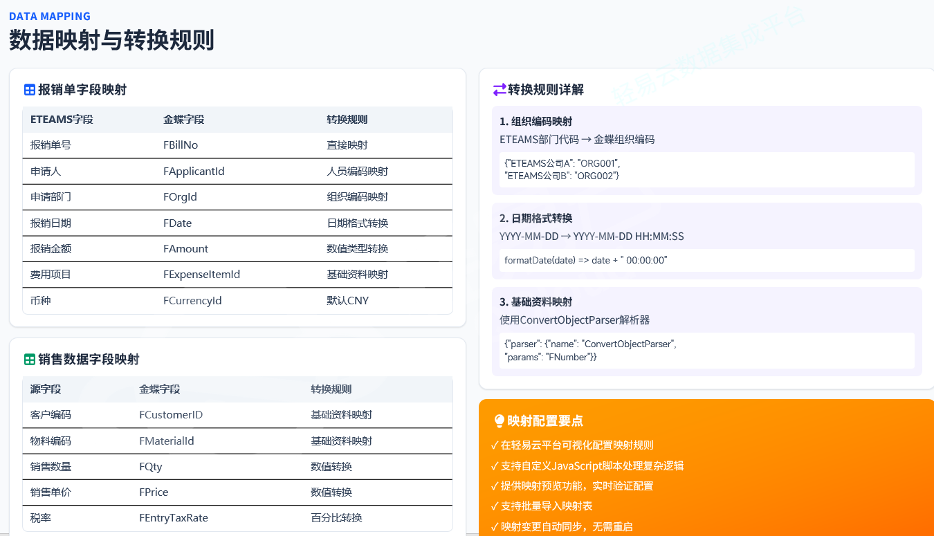 | 技术门槛 | 需熟悉ETEAMS和金蝶双端接口 | 低代码配置 |