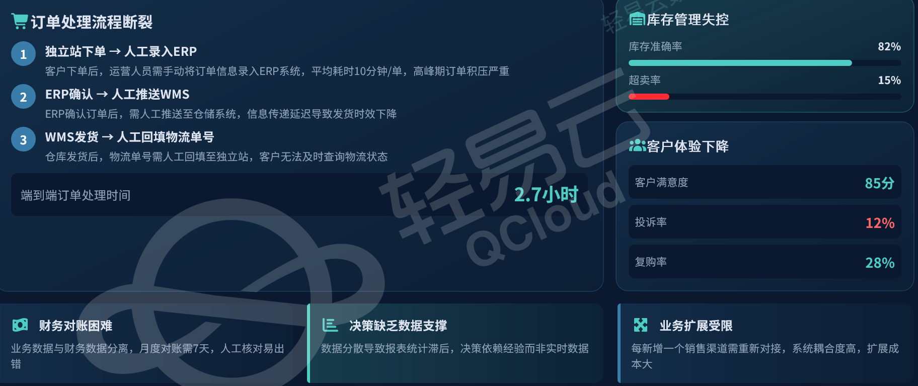 这种断裂的链路导致端到端订单处理时间高达2.7小时,严重影响客户体验。