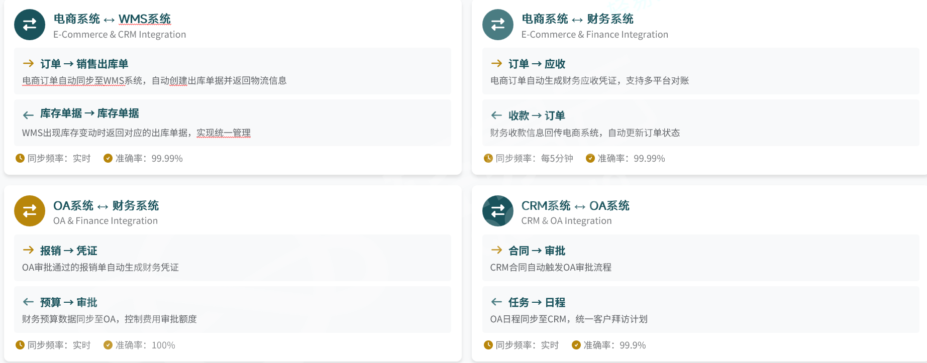 - 客户主数据统一:CRM客户信息同步至ERP、营销自动化平台