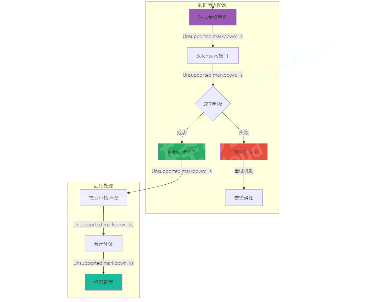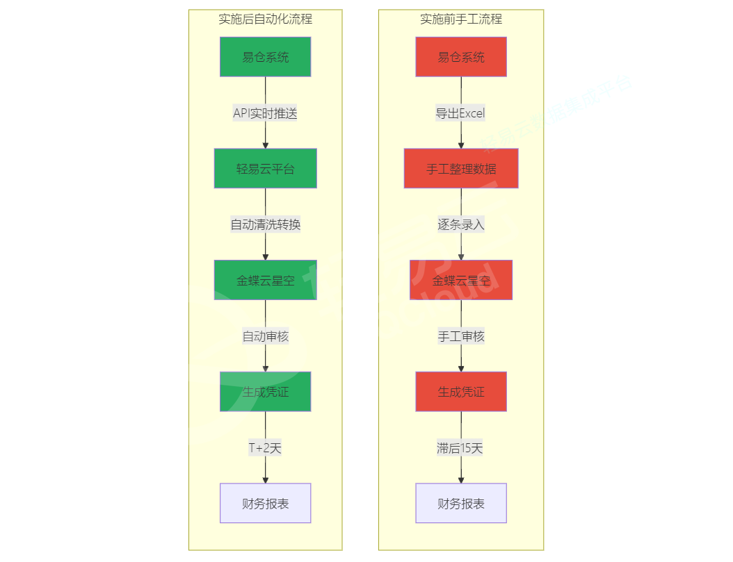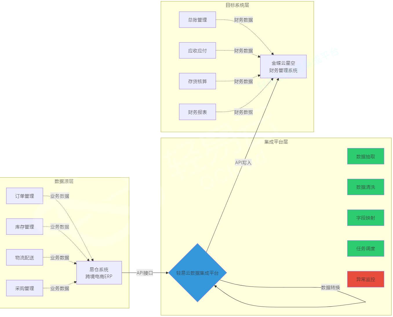 整体集成架构采用星型结构,以数据集成平台为中心,分别与易仓系统和金蝶云星空建立数据通道。业务数据从易仓系统抽取,经过清洗转换后写入金蝶云星空,形成完整的业务到财务的数据闭环。