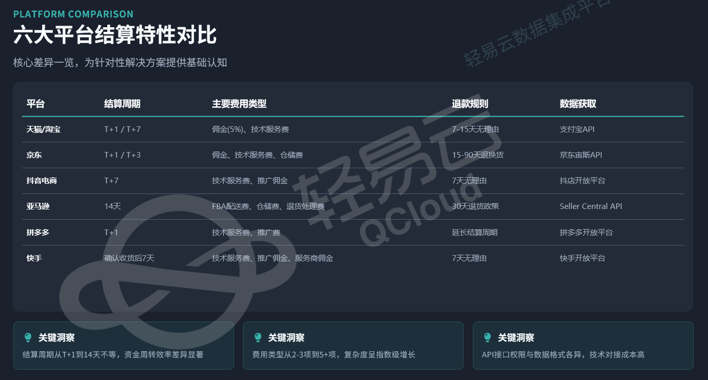 关键差异主要体现在三个方面:结算周期从T+1到14天不等,资金周转效率差异显著;费用类型从2-3项到5+项,复杂度呈指数级增长;API接口权限与数据格式各异,技术对接成本高。