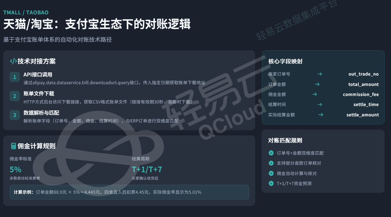 天猫/淘宝基于支付宝账单体系进行结算,技术对接需通过支付宝数据服务接口获取账单下载地址,传入指定日期获取账单下载链接。由于链接有效期仅30秒,需通过HTTP方式后台即时访问下载CSV格式账单文件。数据解析阶段需处理账单字段,包括订单号、金额、佣金、结算时间等核心数据,并与ERP订单进行双维度匹配。
