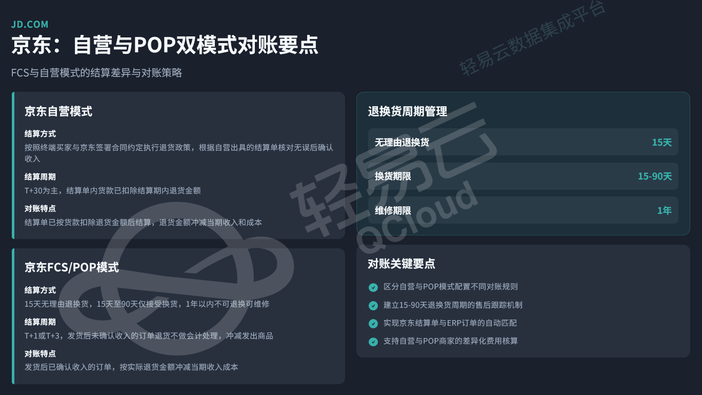 FCS/POP模式下,退换货政策为15天无理由退换货,15天至90天仅接受换货,1年以内不可退换可维修。结算周期为T+1或T+3,发货后未确认收入的订单退货不做会计处理,冲减发出商品;发货后已确认收入的订单,按实际退货金额冲减当期收入成本。对账关键要点在于区分自营与POP模式配置不同对账规则,建立15-90天退换货周期的售后跟踪机制,实现京东结算单与ERP订单的自动匹配,并支持自营与POP商家的差异化费用核算。