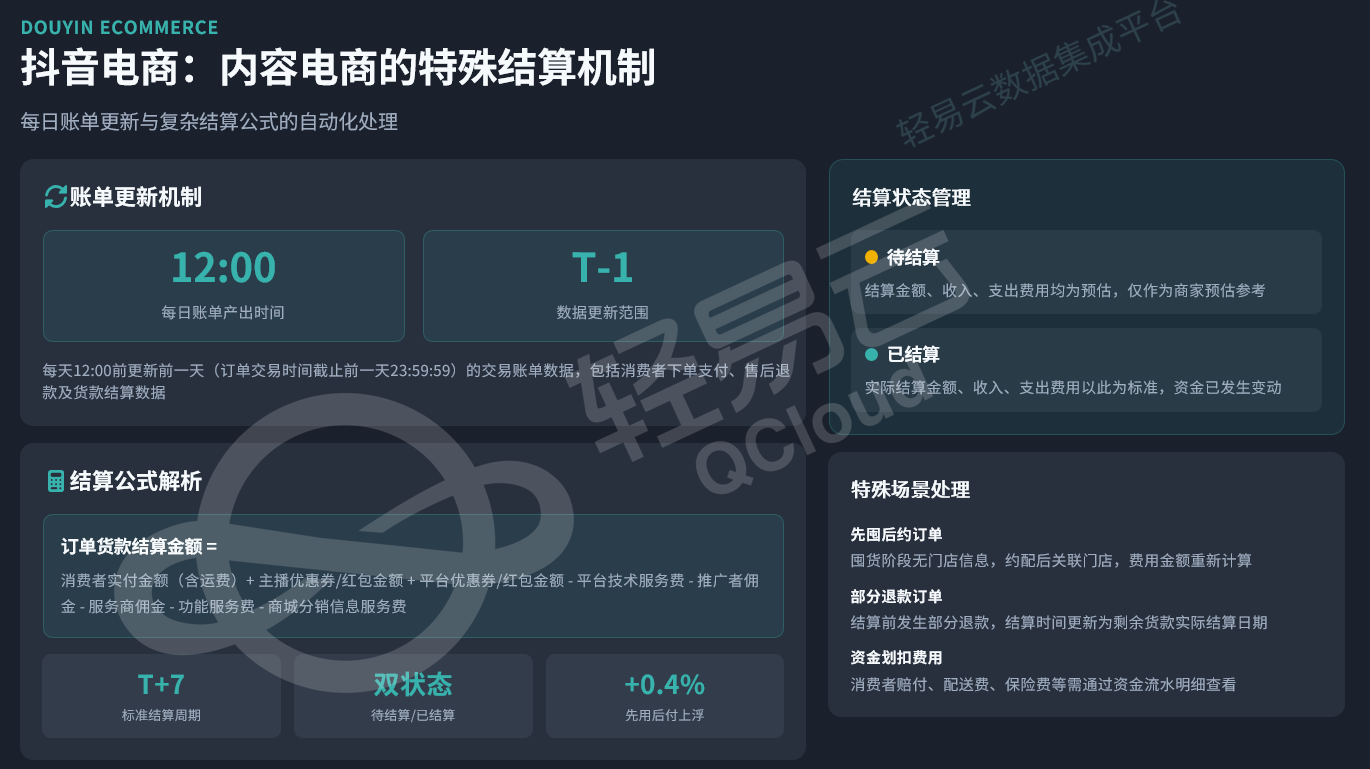 抖音电商采用每日账单更新机制,每天12:00前更新前一天(订单交易时间截止前一天23:59:59)的交易账单数据,包括消费者下单支付、售后退款及货款结算数据。结算公式较为复杂:订单货款结算金额等于消费者实付金额(含运费)加上主播优惠券/红包金额和平台优惠券/红包金额,减去平台技术服务费、推广者佣金、服务商佣金、功能服务费和商城分销信息服务费。