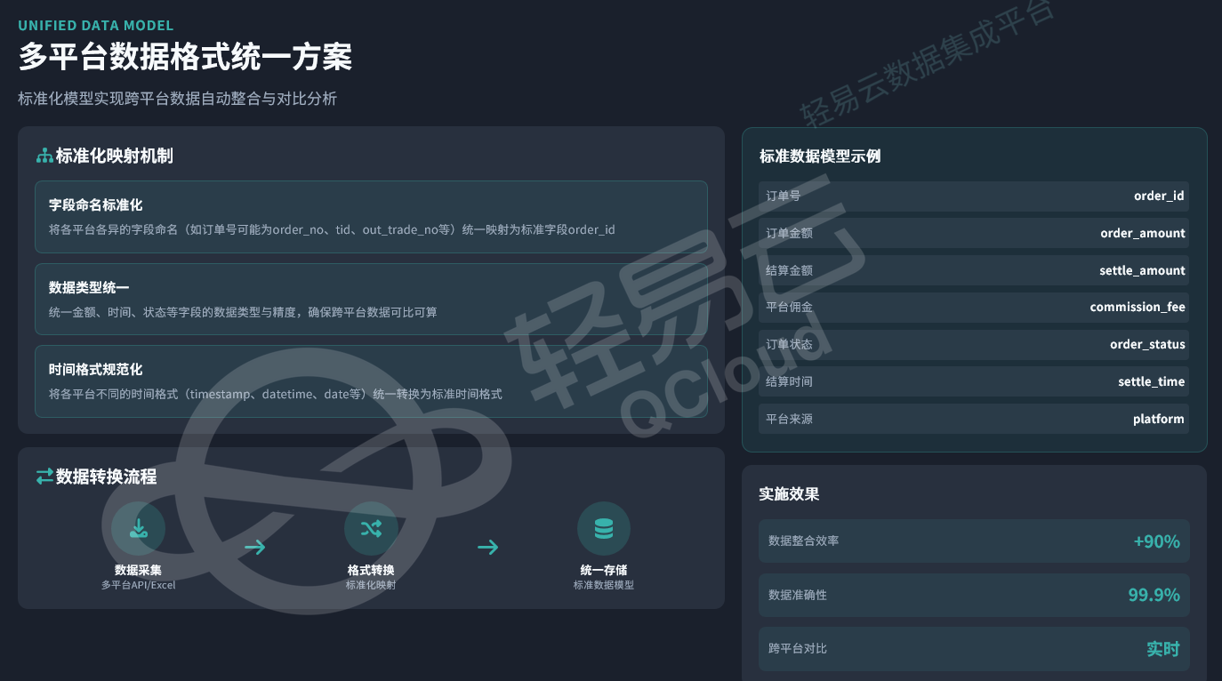 建立统一的数据标准模型是解决数据孤岛问题的关键。通过标准化映射机制,将各平台各异的字段命名(如order_no、tid、out_trade_no等)统一映射为标准字段(order_id),统一金额、时间、状态等字段的数据类型与精度,确保跨平台数据可比可算。时间格式规范化方面,将各平台不同的时间格式(timestamp、datetime、date等)统一转换为标准时间格式。标准数据模型应包含订单号(order_id)、订单金额(order_amount)、结算金额(settle_amount)、平台佣金(commission_fee)、订单状态(order_status)、结算时间(settle_time)和平台来源(platform)等核心字段。
