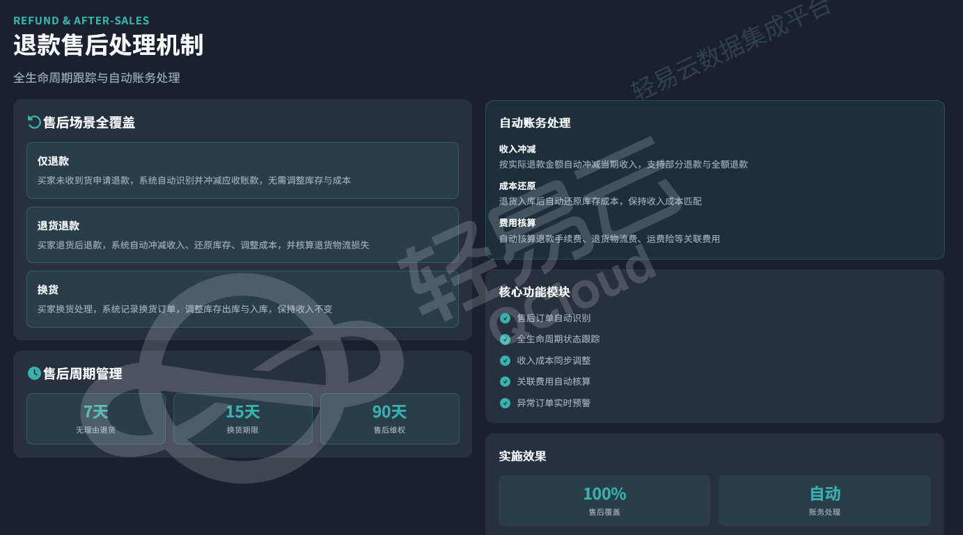建立7天无理由退货、15天换货期限、90天售后维权的全周期跟踪机制,实现自动账务处理。按实际退款金额自动冲减当期收入,支持部分退款与全额退款;退货入库后自动还原库存成本,保持收入成本匹配;自动核算退款手续费、退货物流费、运费险等关联费用。