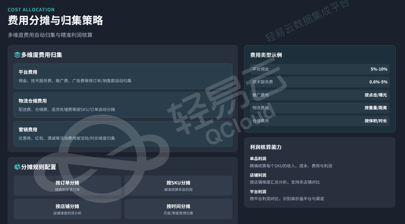 多维度费用归集包括平台费用(佣金、技术服务费、推广费、广告费等按订单/销售额归集)、物流仓储费用(配送费、仓储费、退货处理费等按SKU/订单分摊)以及营销费用(优惠券、红包、满减等活动费用按活动/时间维度归集)。分摊规则配置支持按订单、SKU、店铺、时间等维度的费用分摊,实现单品利润、店铺利润、平台利润的精准核算。