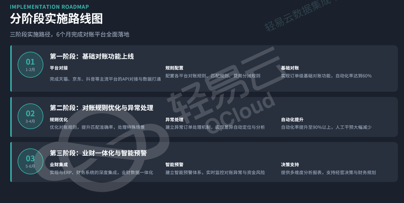 建议采用三阶段实施路线图,预计6个月完成对账平台全面落地。