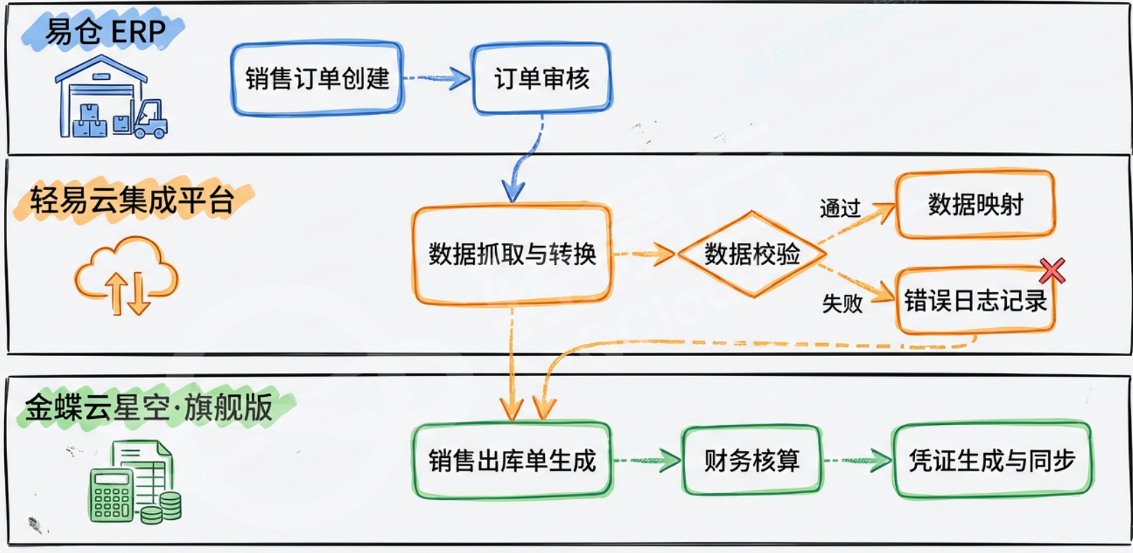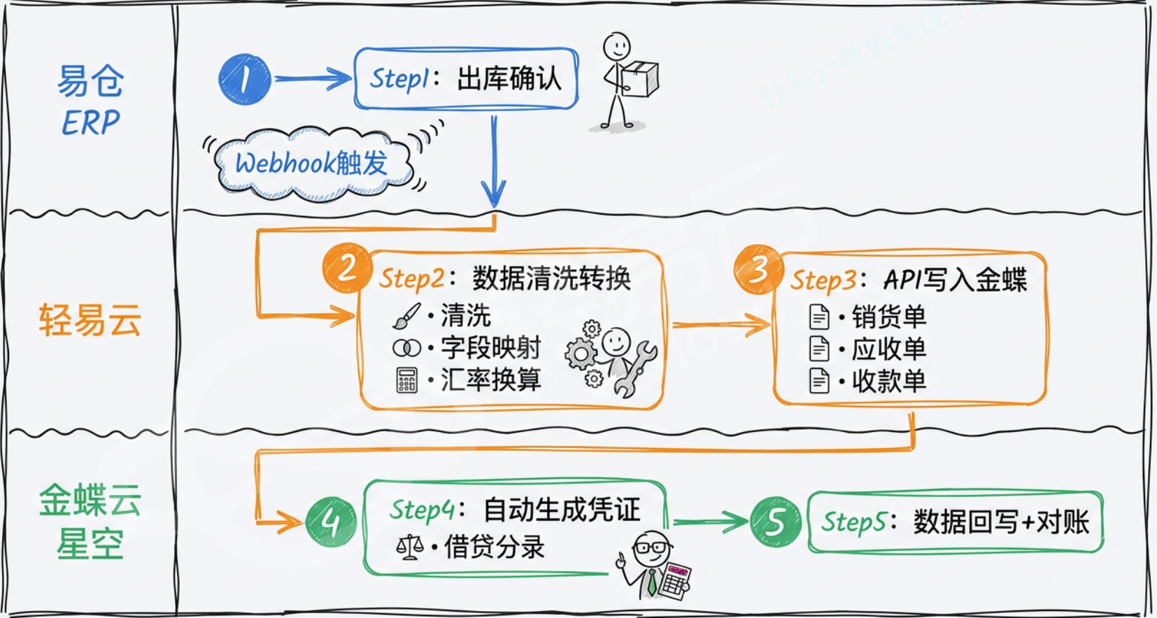 核心思路: 部署轻易云集成平台,打通易仓 ERP 销售出库、退货退款、收款认领数据与金蝶云星空·旗舰版,订单出库即触发应收单、收款单、税务凭证的全自动生成与核对,财务从录单员升级为审计员。