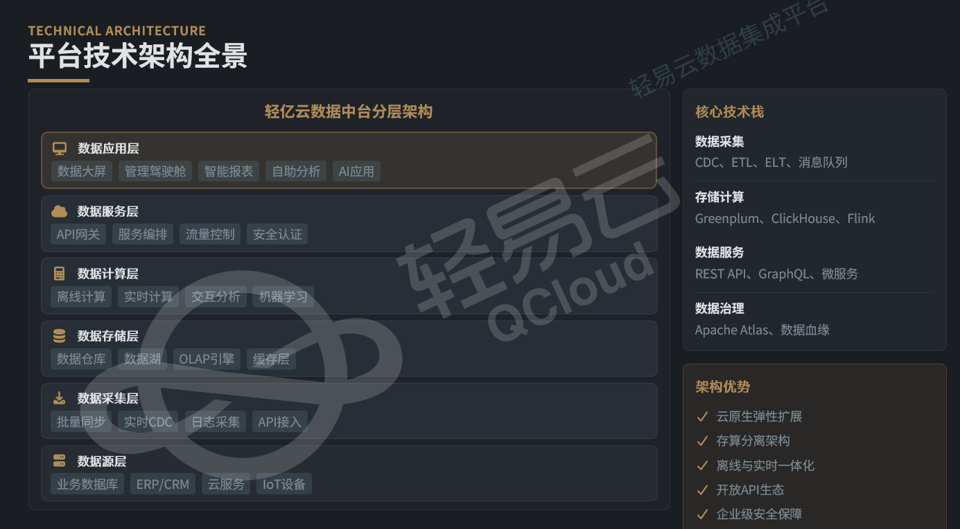 数据采集层采用CDC、ETL/ELT技术和消息队列;存储计算层基于MPP数据库、列式存储和流计算引擎;数据服务层支持REST API、GraphQL和微服务架构;数据治理层利用元数据管理工具实现数据血缘追踪。