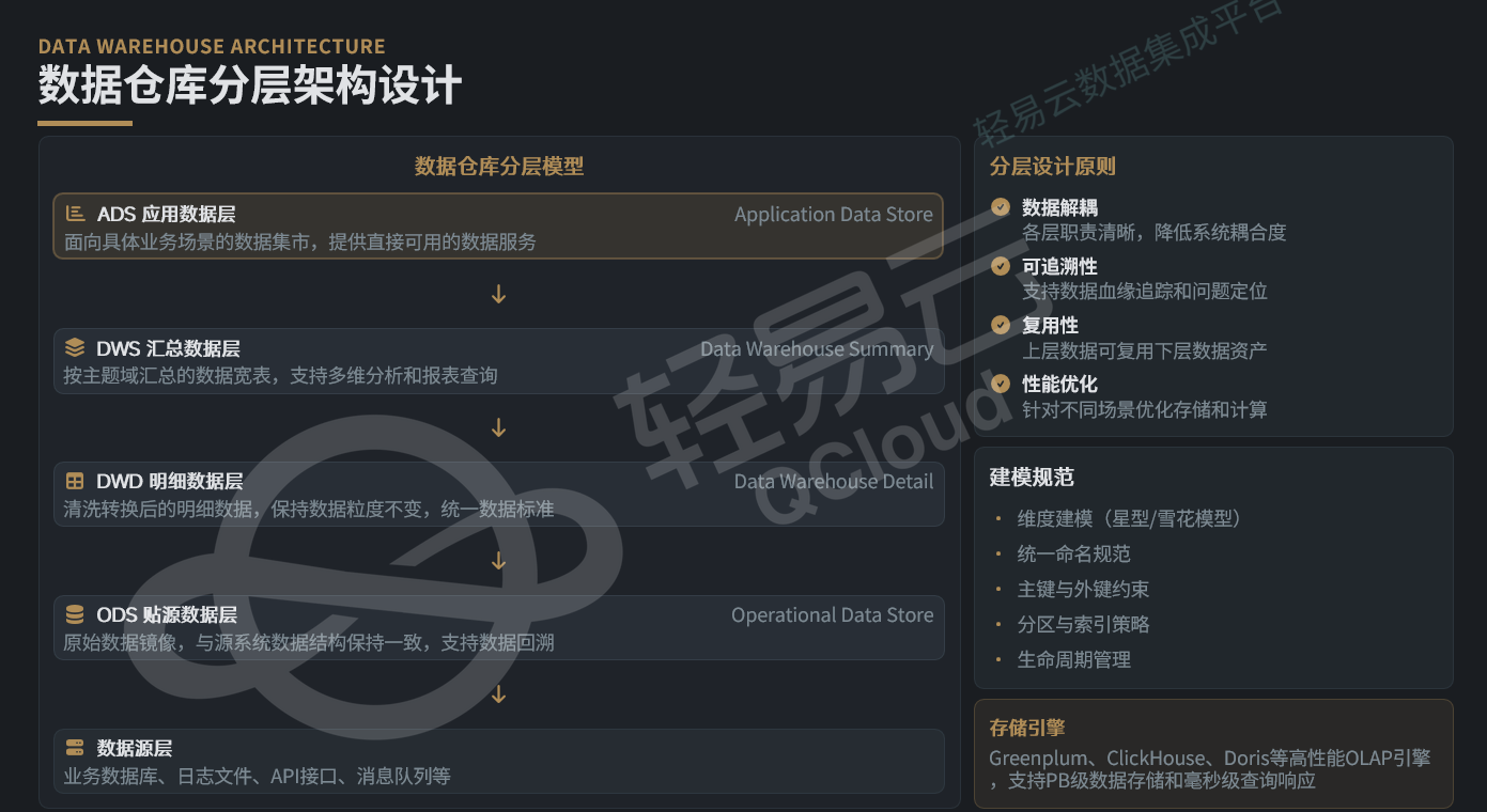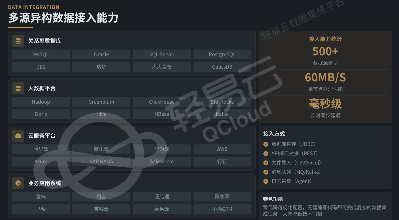 数据采集层:负责多源异构数据的接入,包括批量同步、实时CDC(Change Data Capture)、日志采集、API接入等方式。