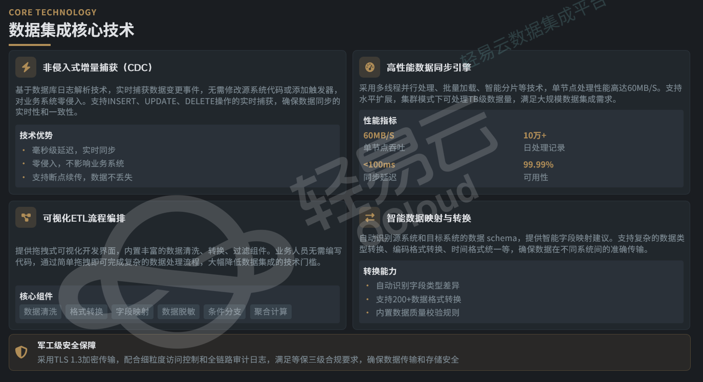 CDC(Change Data Capture)技术基于数据库日志解析,实时捕获INSERT、UPDATE、DELETE等数据变更事件,无需修改源系统代码或添加触发器,对业务系统零侵入。该技术支持断点续传,确保数据不丢失,可实现毫秒级延迟的实时同步。