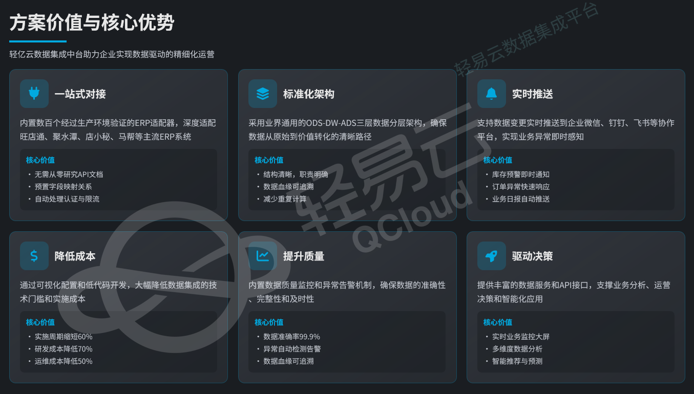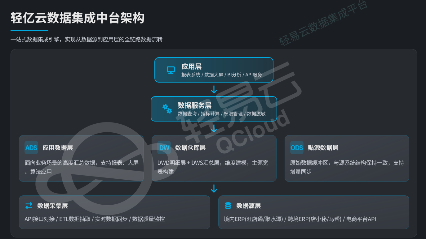 涵盖境内ERP(旺店通、聚水潭、网店管家等)、跨境电商ERP(店小秘、马帮、通途等)以及电商平台开放API。这一层的数据特点是格式多样、更新频繁、业务逻辑耦合度高。