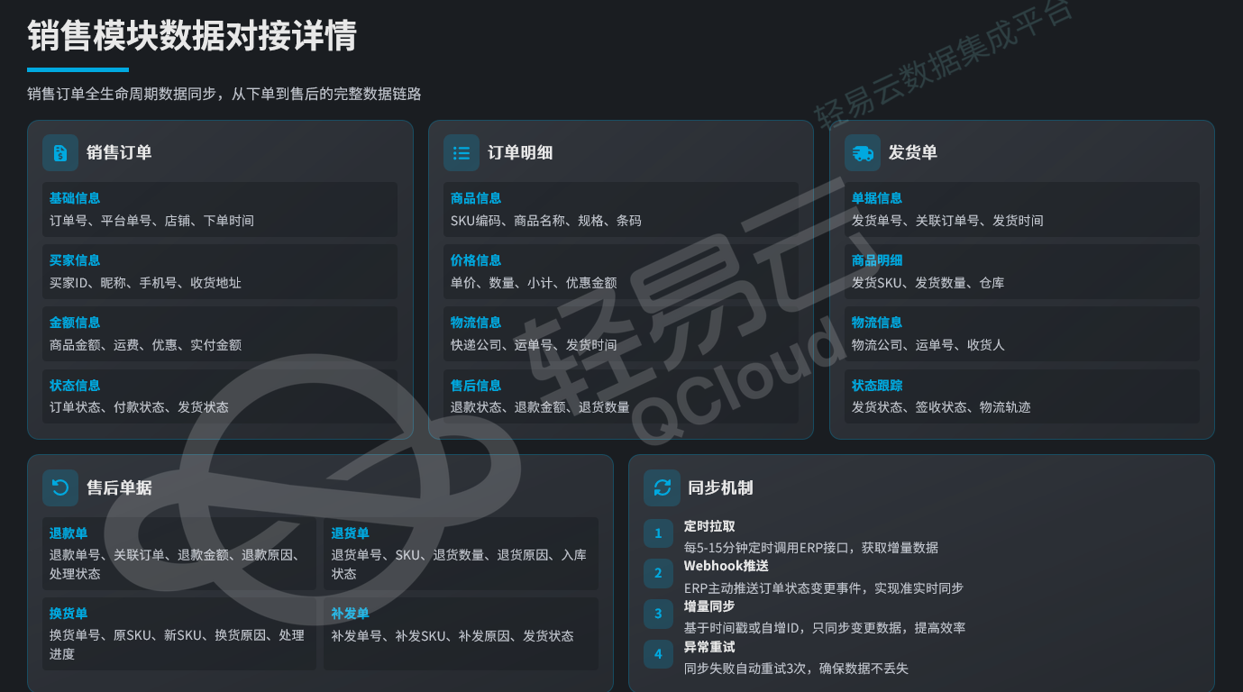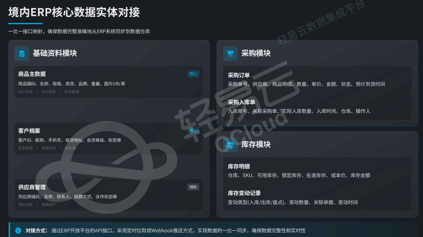 主流境内ERP系统(旺店通、聚水潭等)的对接需关注以下数据实体: