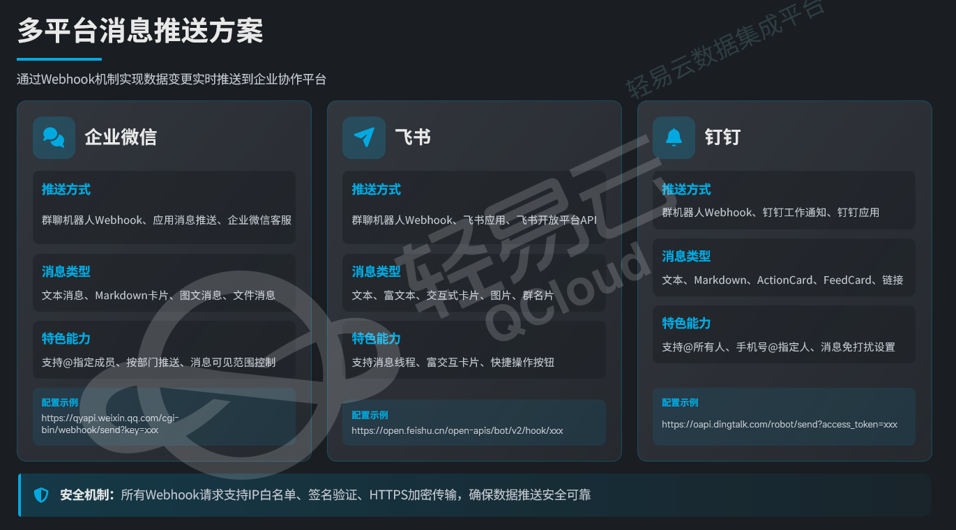 安全机制包括IP白名单、签名验证(如钉钉的加签算法)、HTTPS加密传输,确保数据推送的安全性。