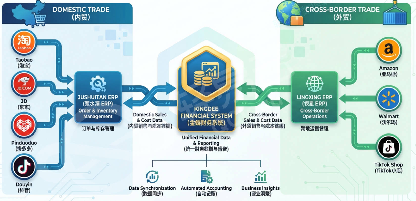 今天我们就来聊聊,内贸+外贸一体化的企业,如何通过聚水潭ERP、领星ERP与金蝶云星空的协同,实现"业务流→财务流"的完整闭环。