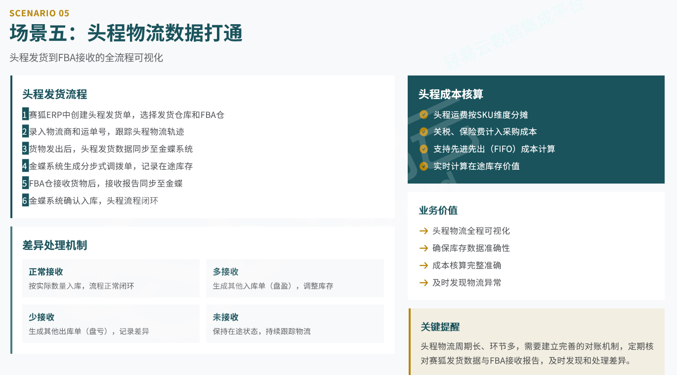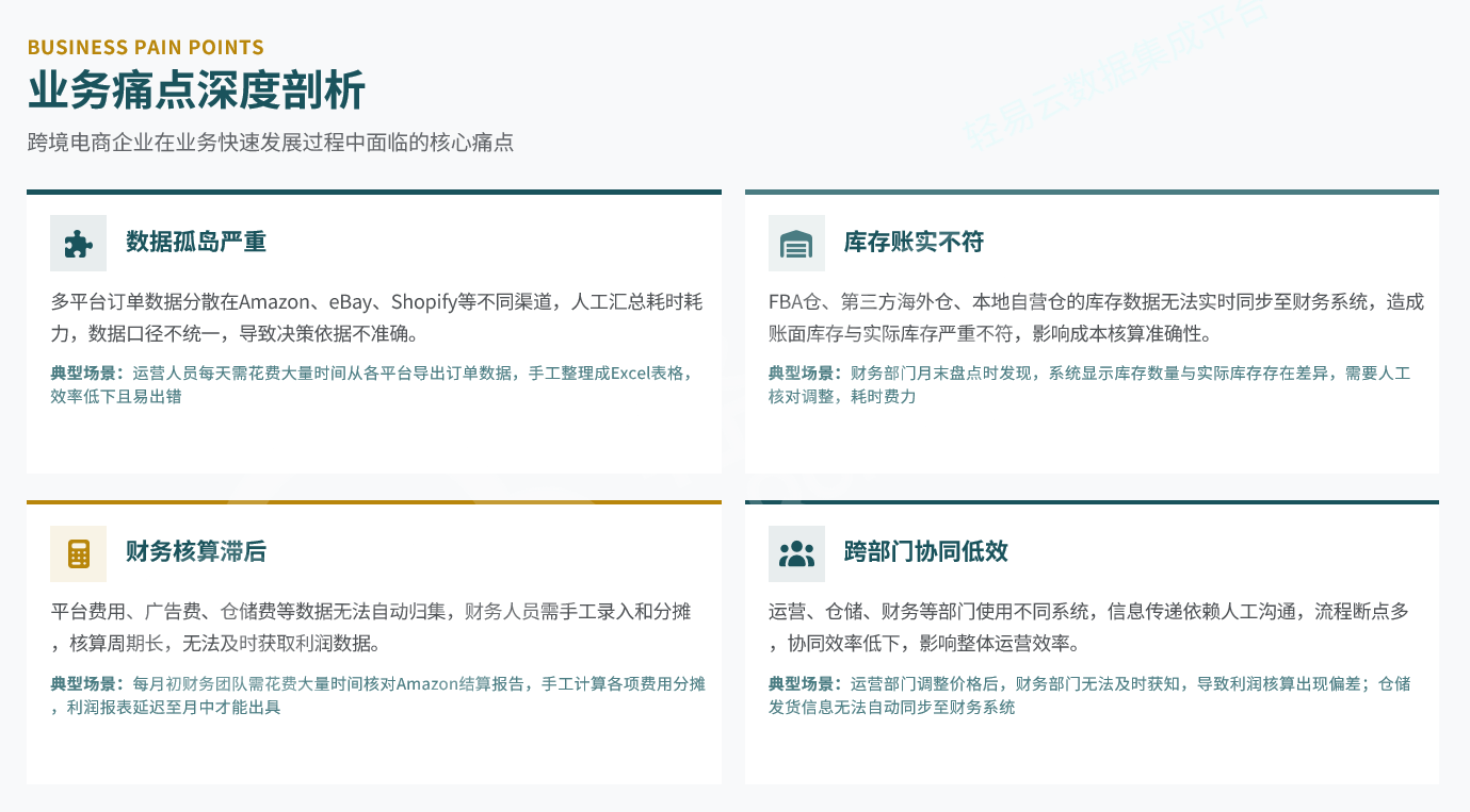 - 库存账实不符:FBA仓、海外仓、本地仓库存数据无法实时同步至财务系统,导致成本核算偏差