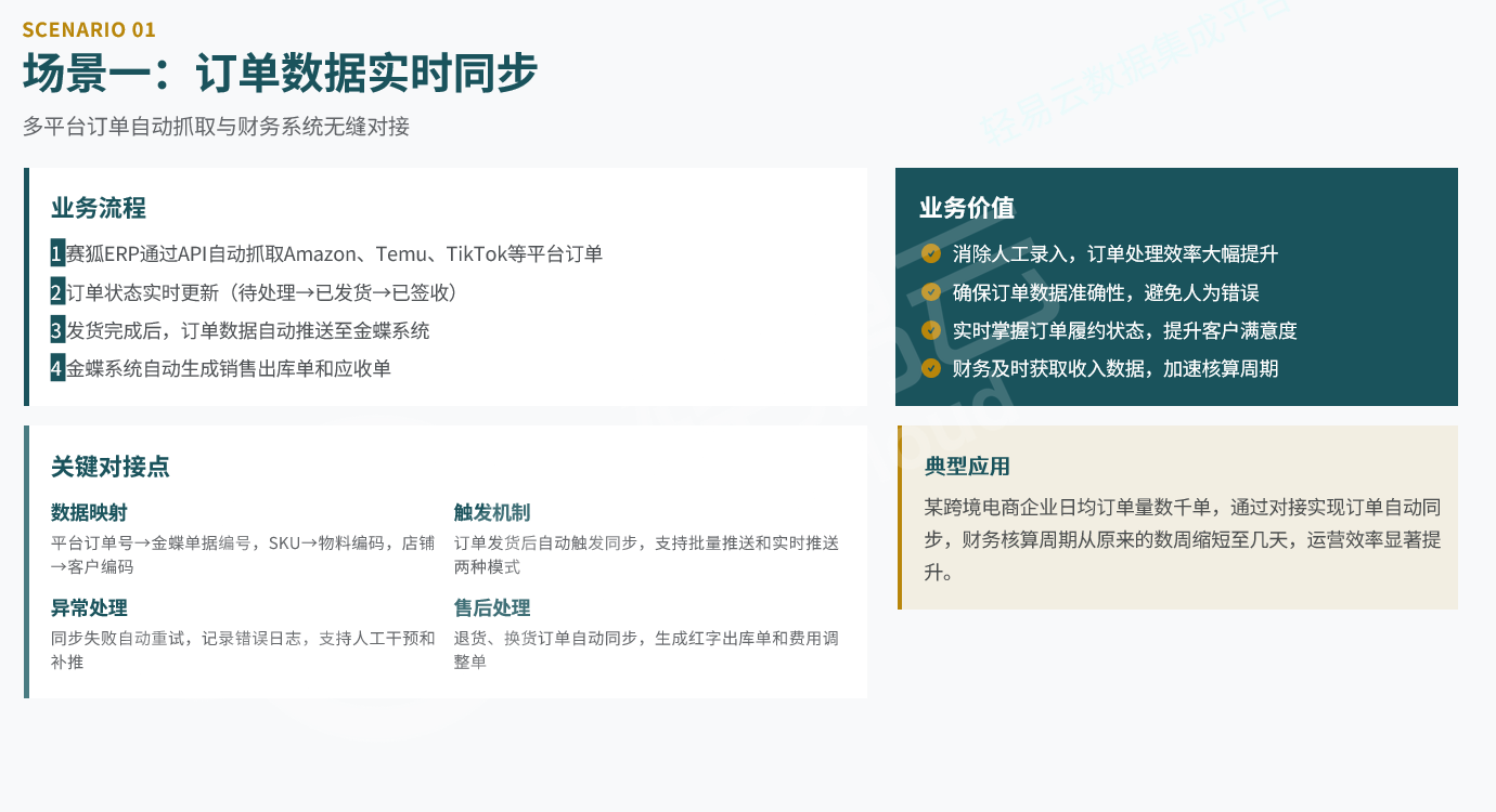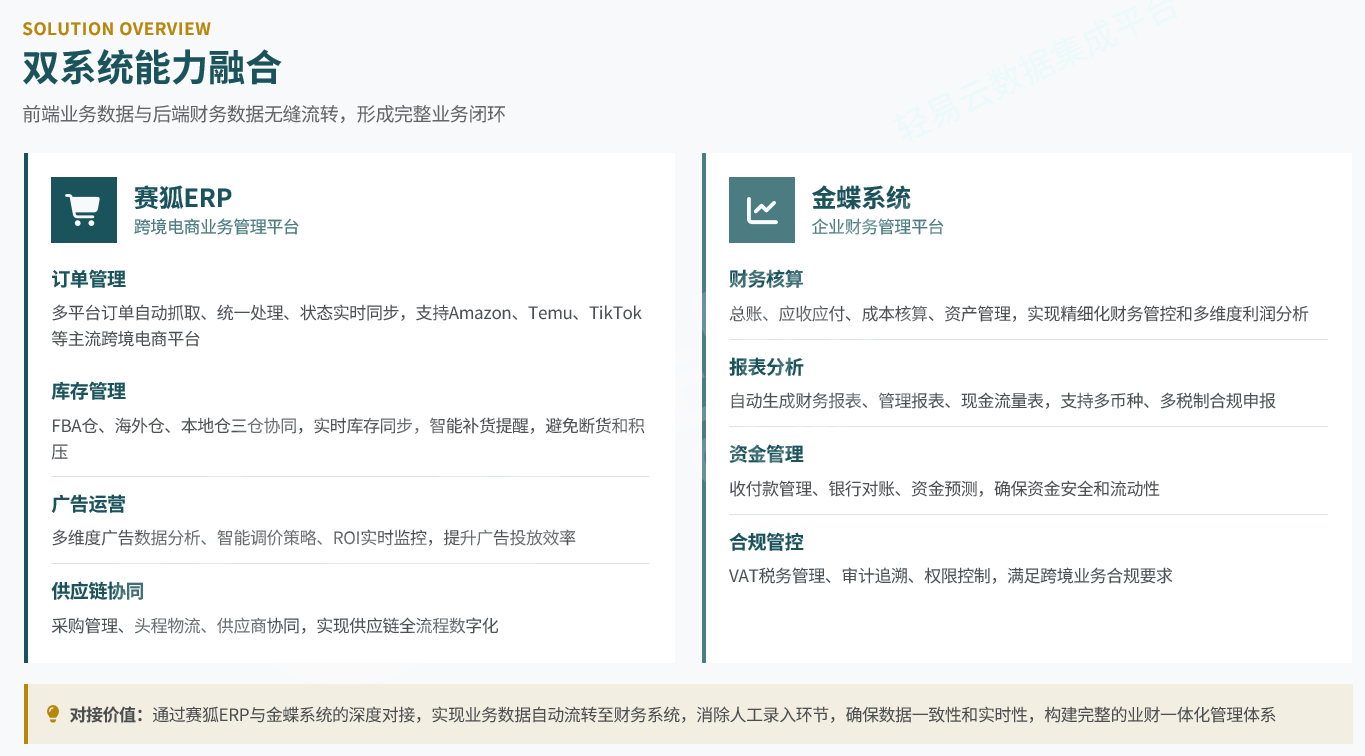 跨境电商业务的高速发展带来了多平台运营、多仓库管理、多币种结算等复杂场景。赛狐ERP作为业务端管理平台,与金蝶财务系统的深度对接,旨在解决业务数据与财务数据割裂的核心问题,实现端到端的流程自动化。本文基于实际对接案例,梳理技术实现路径与关键业务场景。