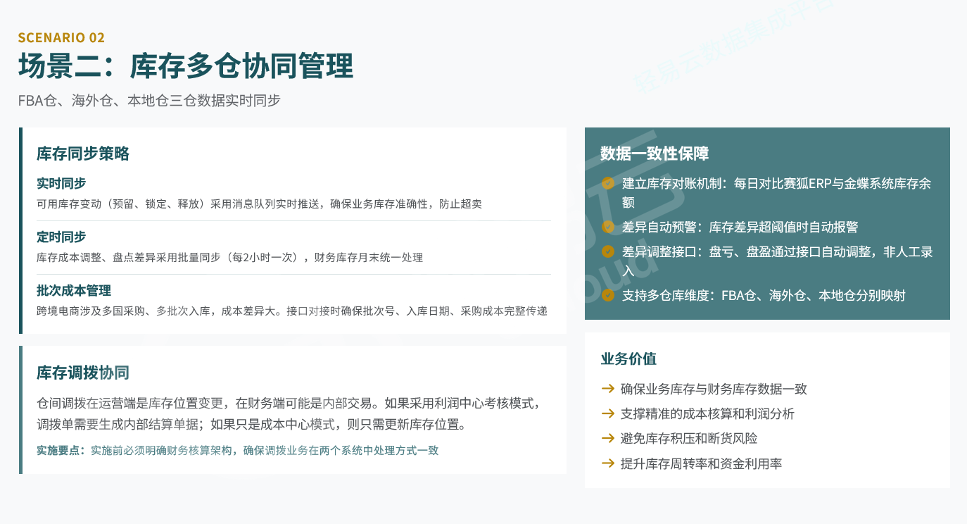 - 定时同步:库存成本调整、盘点差异每2小时批量同步