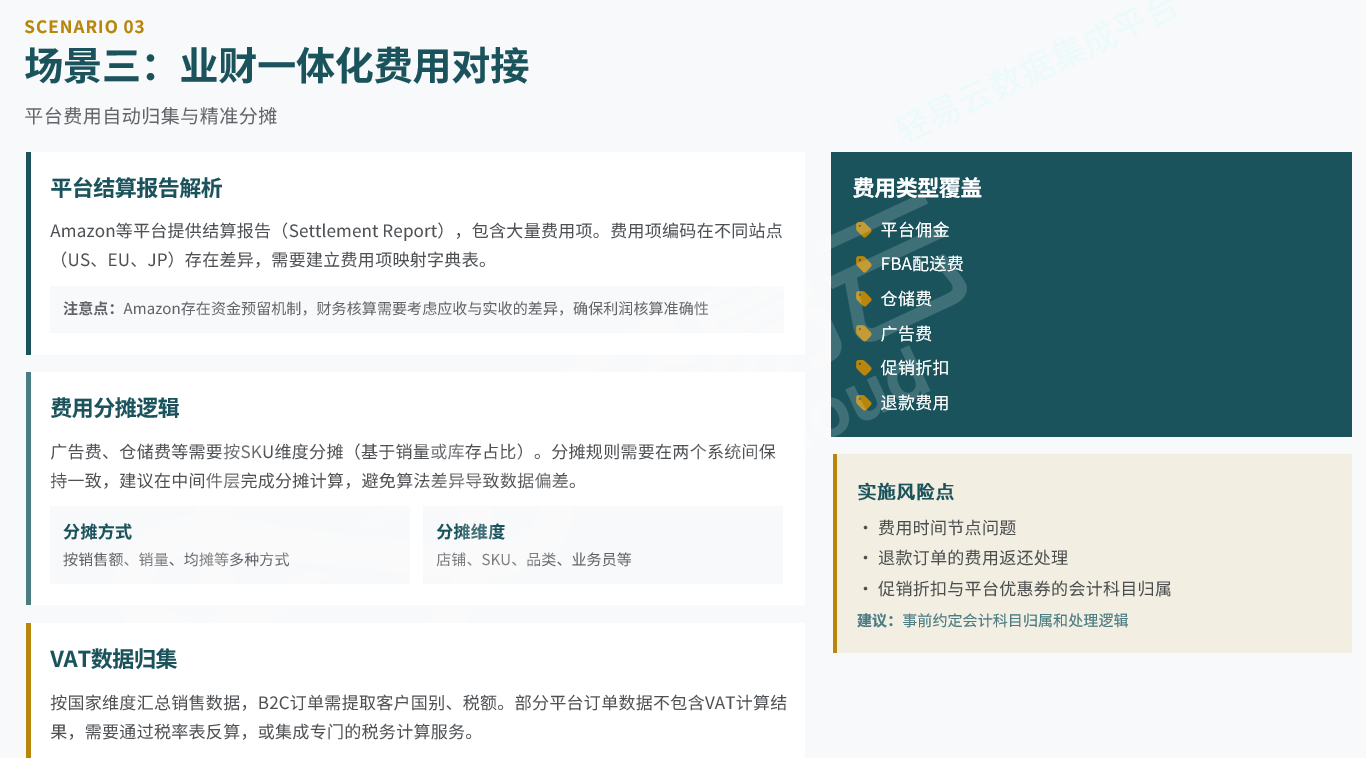 - 费用分摊规则复杂:广告费、仓储费需按SKU维度分摊,涉及多种分摊算法