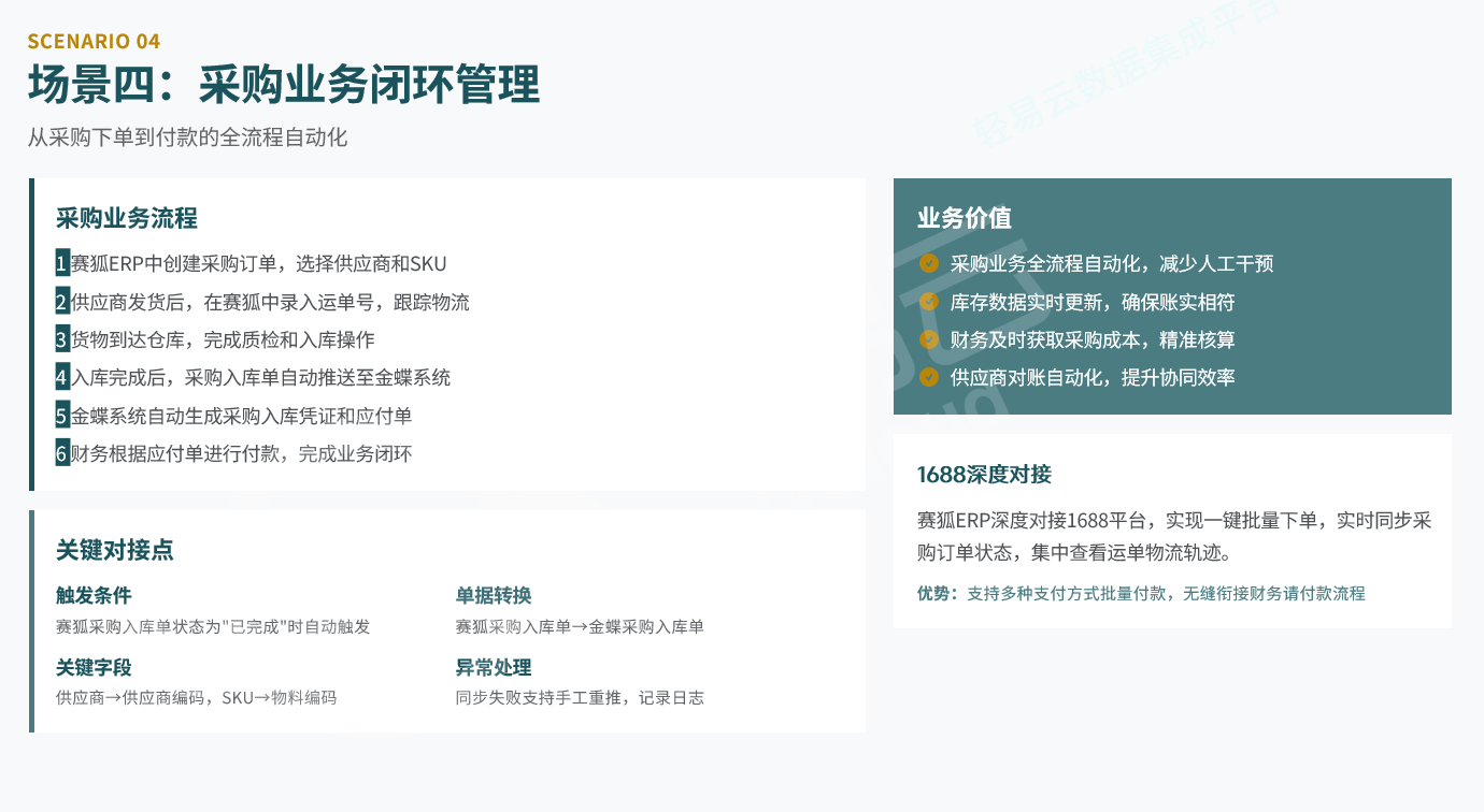 赛狐采购订单 → 供应商发货 → 质检入库 → 推送金蝶 → 生成应付单 → 财务付款